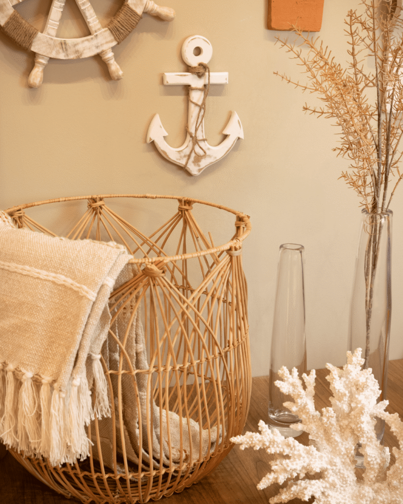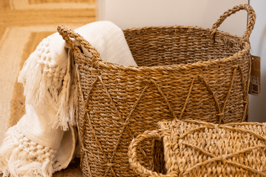 Cestos redondos em rattan natural acomodam mantas e almofadas com elegância, criando um cantinho de descanso com estilo.